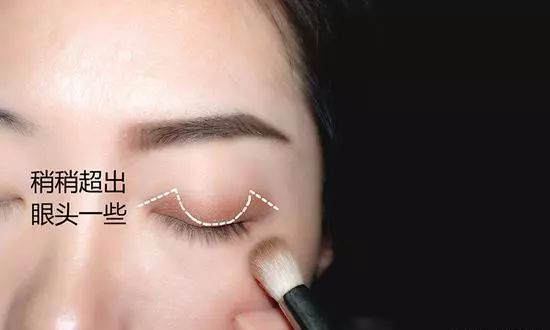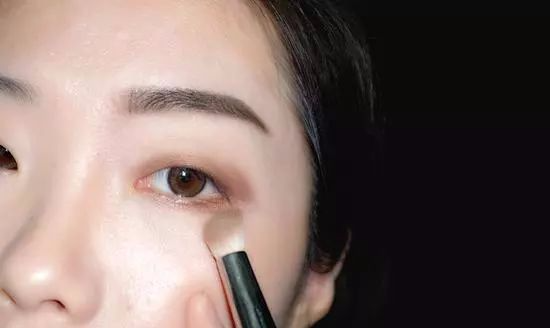 3.用哑光【土棕色】打造假眼窝,增加单眼皮的轮廓感。用长毛眼影刷沾取哑光土棕色,反复渲染眼窝位置加深眼窝。