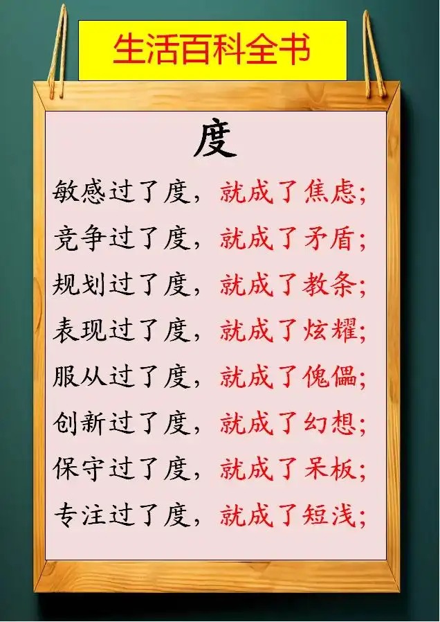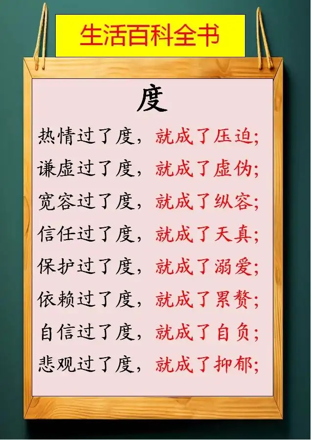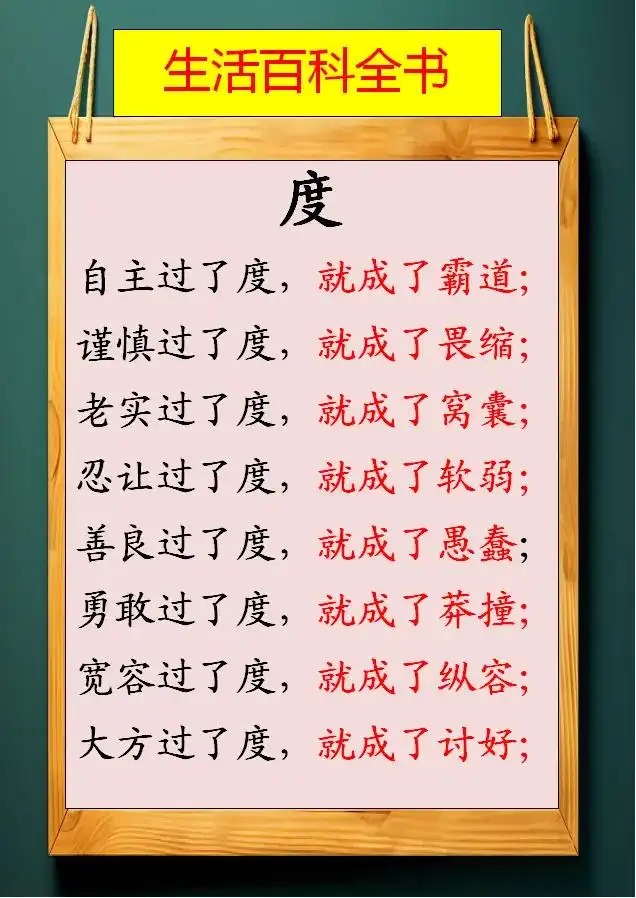 生活百科全书: 古人云“过犹不及”,世间万物皆有其衡,月满则亏,水满则溢。做人做事把握一个“度”相当重要!物极必反,唯有掌握恰到好处的分寸,方能在人生的航道上避开暗礁,行稳致远。