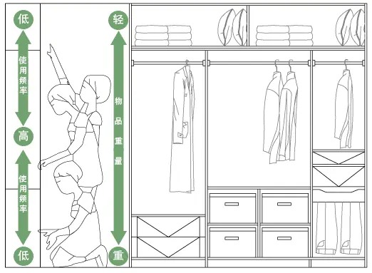 衣橱收纳同样是这样,例如把当季、使用频率高的衣物,放在衣橱中心最容易拿取的位置。