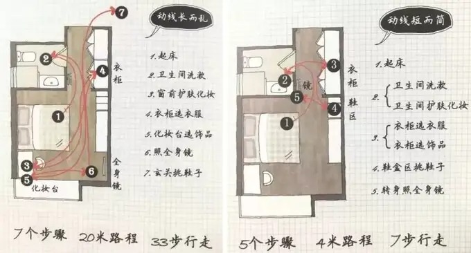 从上图动线设计的对比图可看出,右图的路线更短,所需的动线路程也更简单。