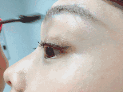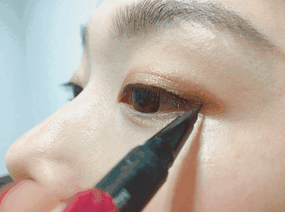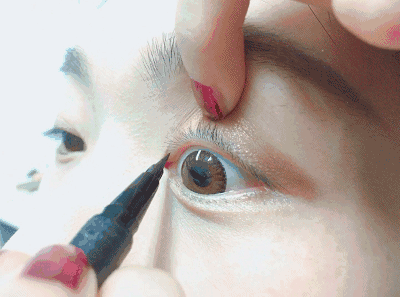 内眼线:先把眼皮翻出来,第一步是画内眼线,用眼线笔把睫毛根部填满。
