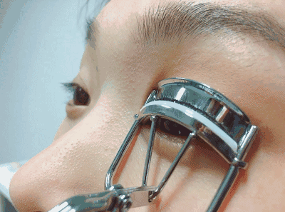 用睫毛夹贴近睫毛根部,分根部、中部、尖端三步把睫毛夹翘。