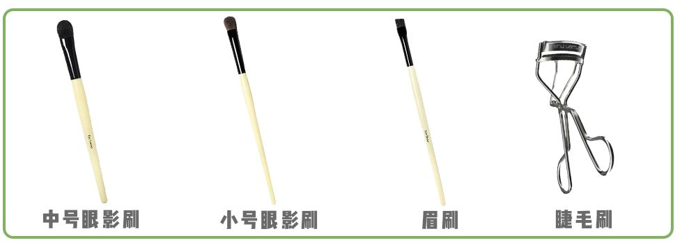 眼妆:眉刷,大号眼影刷,中号眼影刷,睫毛夹。