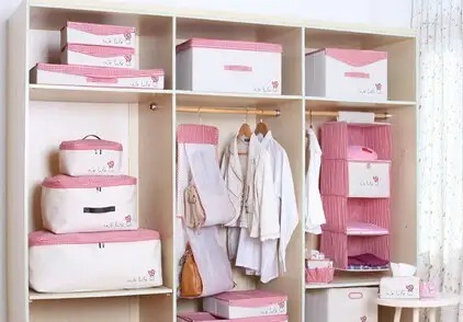 觉得自己衣柜小,所以没有费心设计,只是用层板简单分隔。等到用的时候,发现层板之间并不能百分百利用,衣服摞得太高,找的时候非常不方便。如果无法更改层板的位置,建议你购买这种储物盒子,塑料的用来放零碎物品,棉布质地的盛放衣物,尽可能弥补缺憾,让衣柜内部空间发挥更大效用。