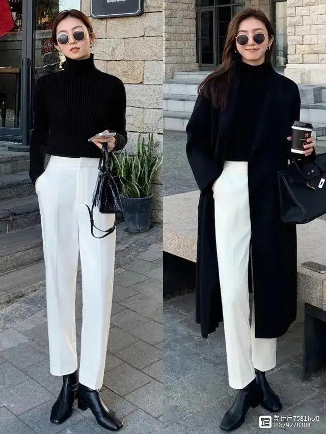 若是做职场穿搭,那试试毛衣和烟管裤的组合。烟管裤最初属于工作场所的单一产品,剪裁整洁时尚,选择9分设计,不仅能创造精神,还能增加严肃感,让你的衣服看起来更有工作场所的氛围。然而,为了避免工作场所穿太枯燥,最好从下图中的白色烟管裤开始,可以更有效地提亮造型,穿出明亮的效果。