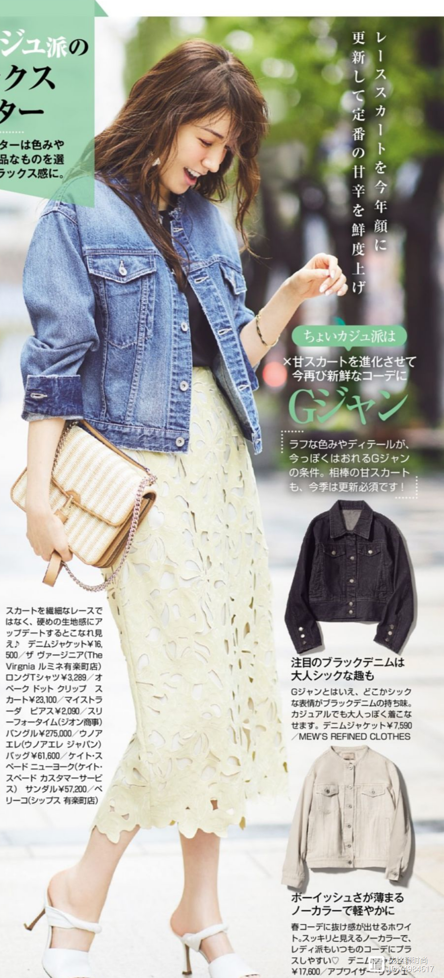 例如这件蓝色牛仔短外套,它匹配的是米黄色的半身裙,而裙装中充斥着各种镂空的形式,更具女人味,也可以与牛仔外套的减龄效果形成平衡。