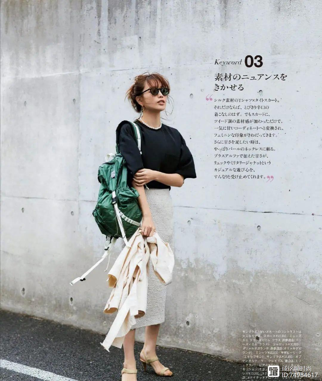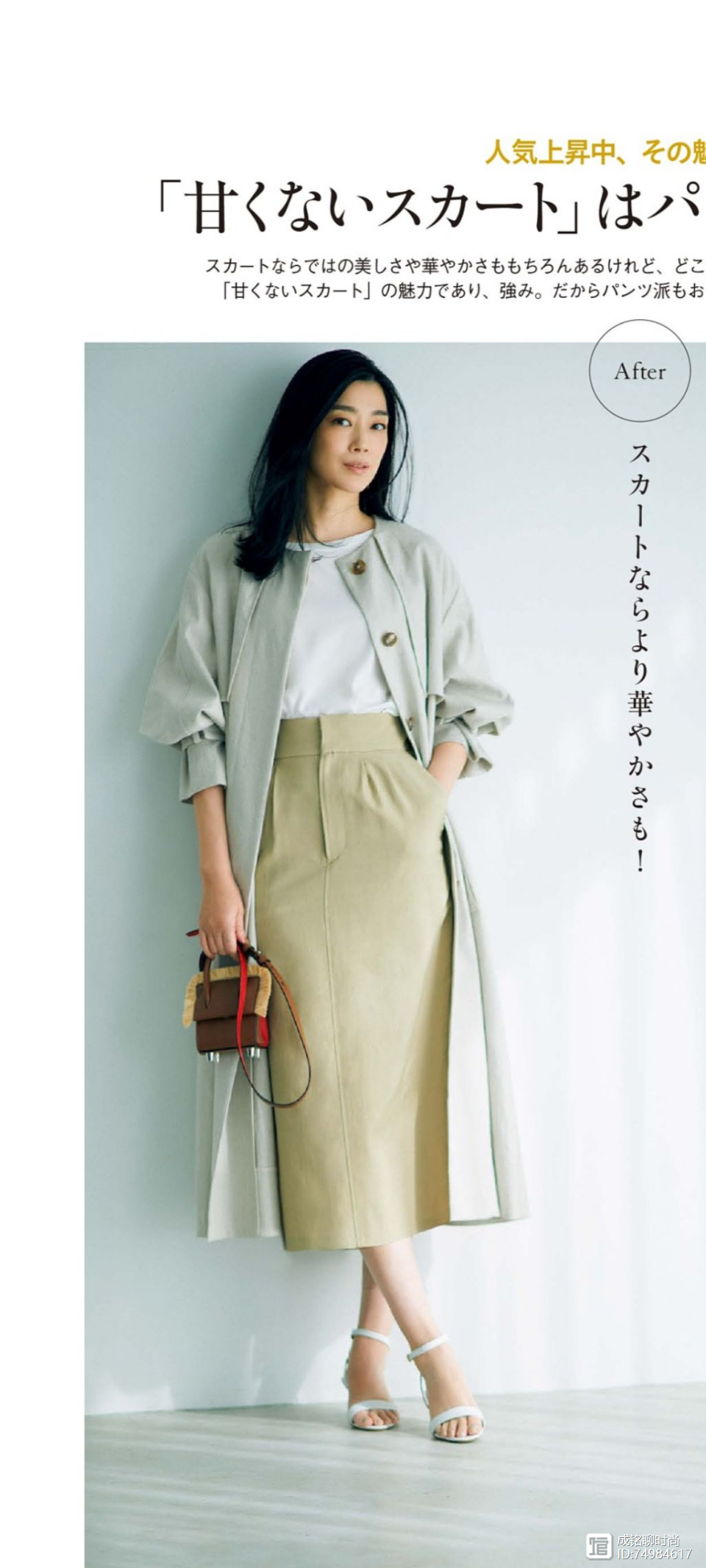 如果喜欢裙装的话,可以借助过膝半身裙来创造出优雅感。像这款裙装,它的整个裙面设计简洁,而裙摆可以使脚踝以及一部分的小腿线条有所体现,更显高。