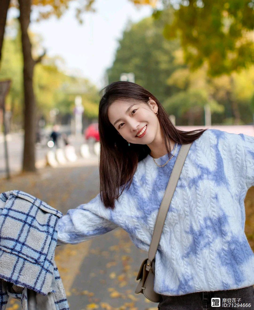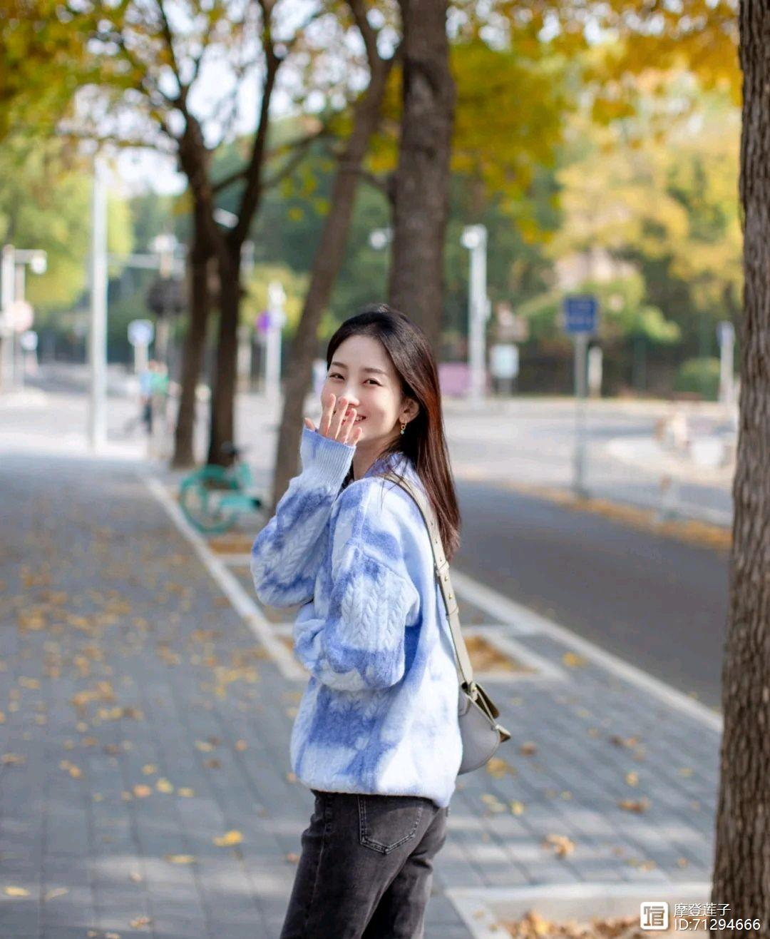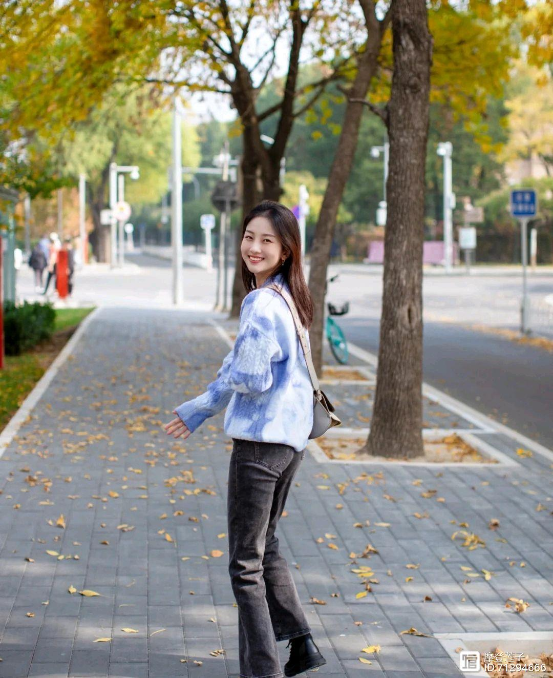 这位时尚博主选择了一件以白色为底色印有蓝色花纹的毛衣搭配深灰色牛仔裤,并且还选择了一件颜色很接近毛衣的羊羔毛外套来搭配,穿出来的视觉效果干净又温柔,如果觉得天气没那么冷的话,那么单独穿一件毛衣就可以,如果天气偏冷的话,那就搭配一件同色系羊羔毛外套,穿出来的感觉别有一番风味。