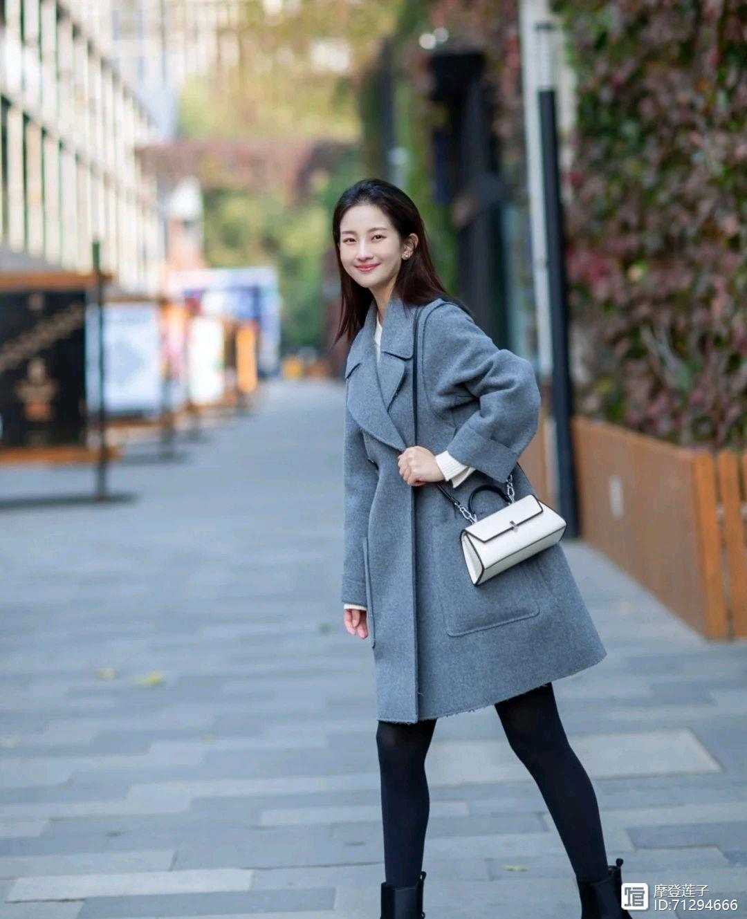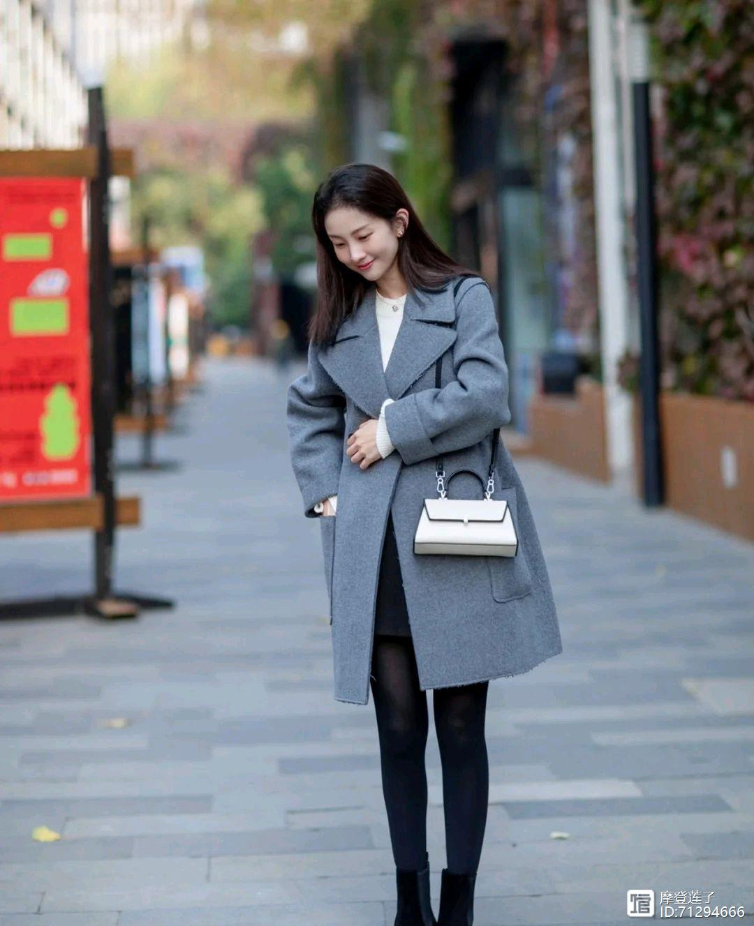 再说了,中长款设计的大衣搭配黑色打底裤之后,大衣的下摆可以起到遮挡的作用,所以哪怕是腿型不够完美的女生也可以借鉴这类似的穿搭,既简单又耐看。