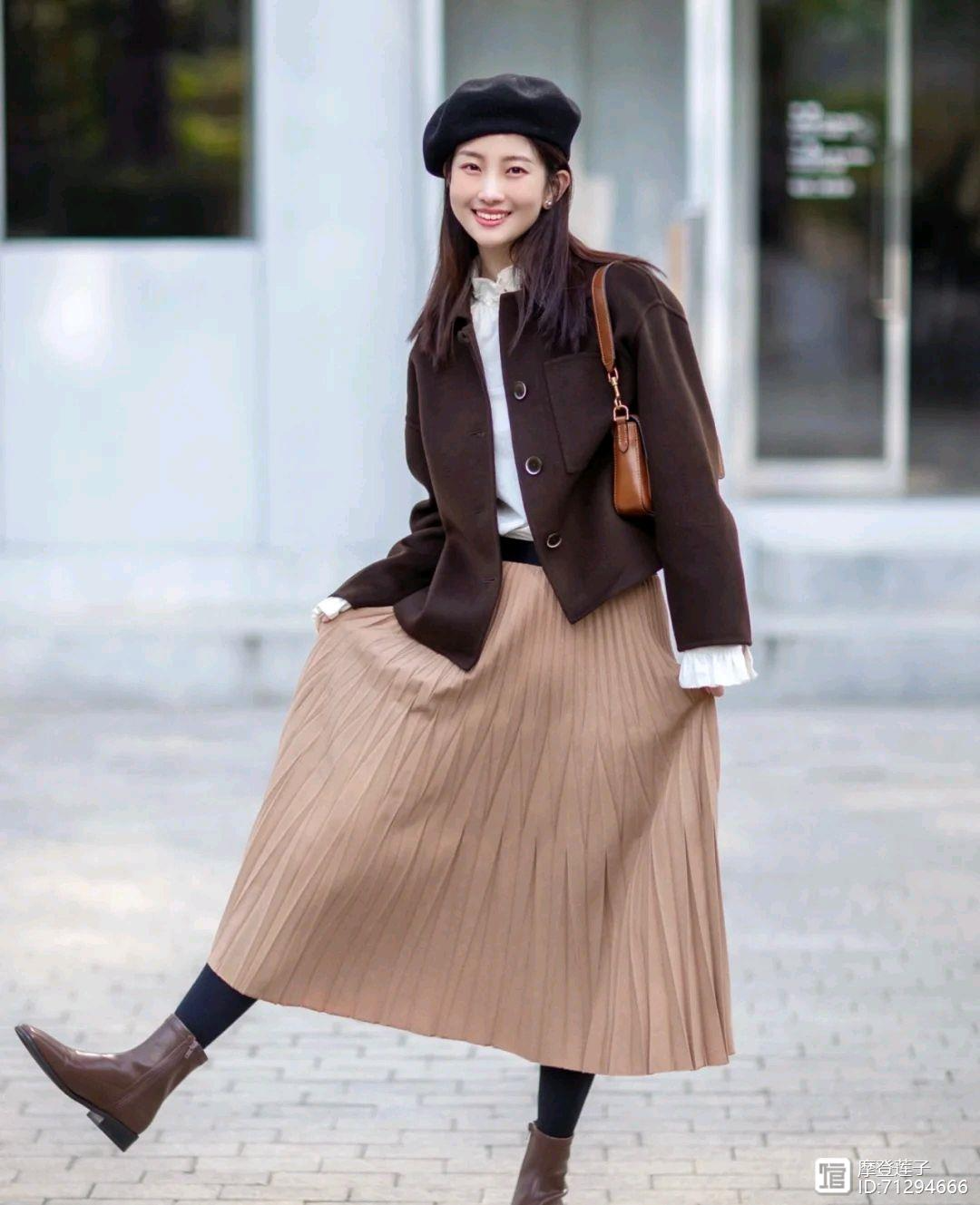 这位时尚博主选择了卡其色半身裙来搭配,这条半身裙也是很简约的设计,不过却采用了褶皱的处理,也就是我们常说的百褶裙,这样的半身裙穿在身上可以起到修身的作用,还能避免单调感。