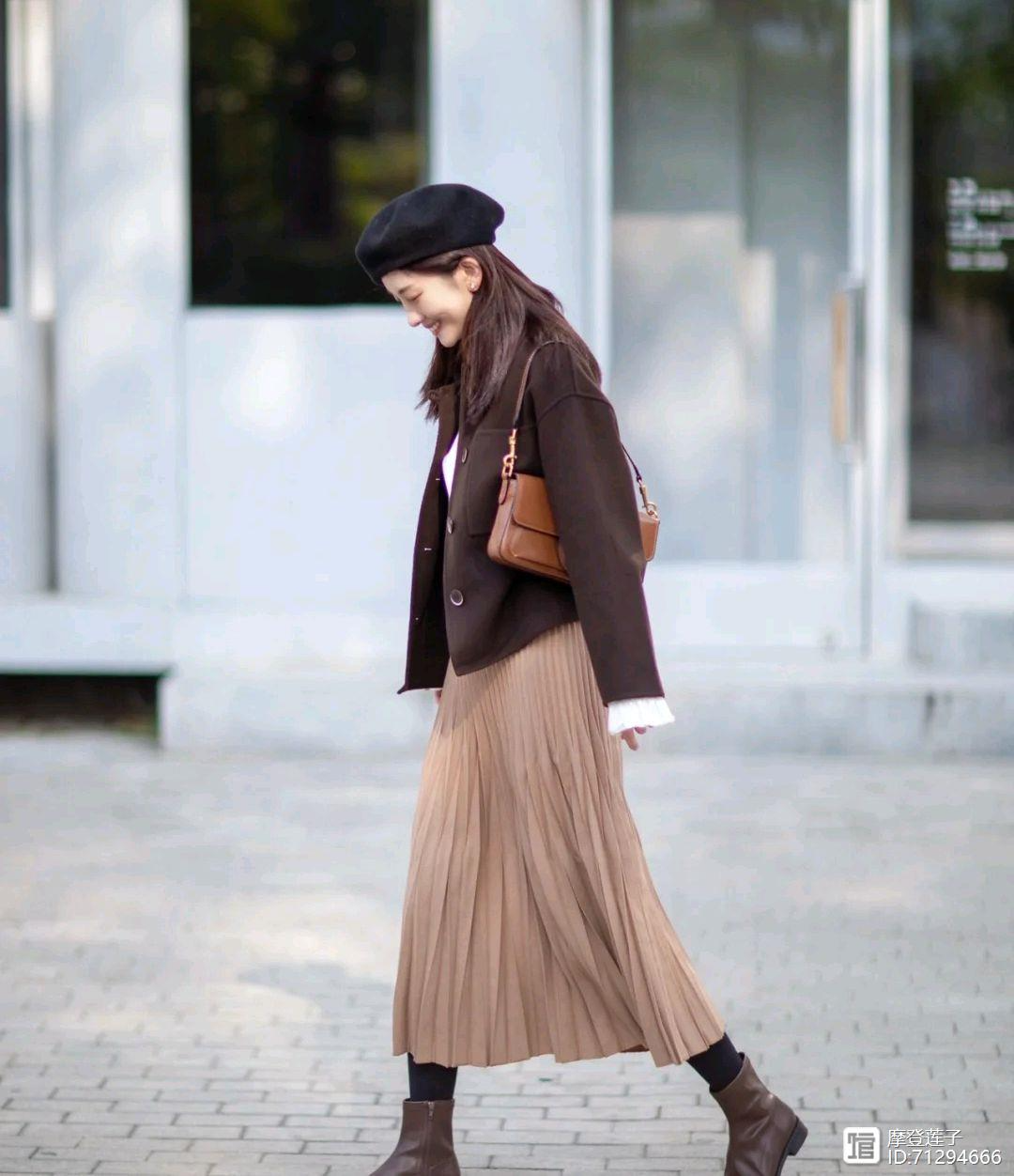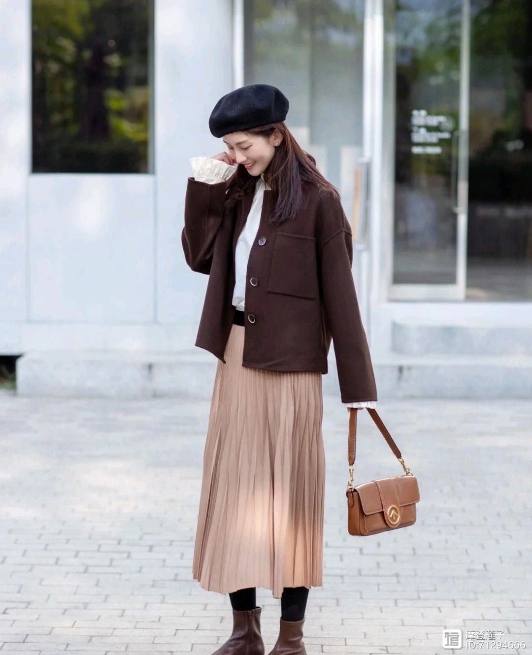 这位时尚博主选择了一件简简单单的驼色外套搭配卡其色半身裙,并且还选择了驼色短靴来搭配,穿出来的视觉效果既复古又时髦,而且还带有一丝丝的俏皮感。
