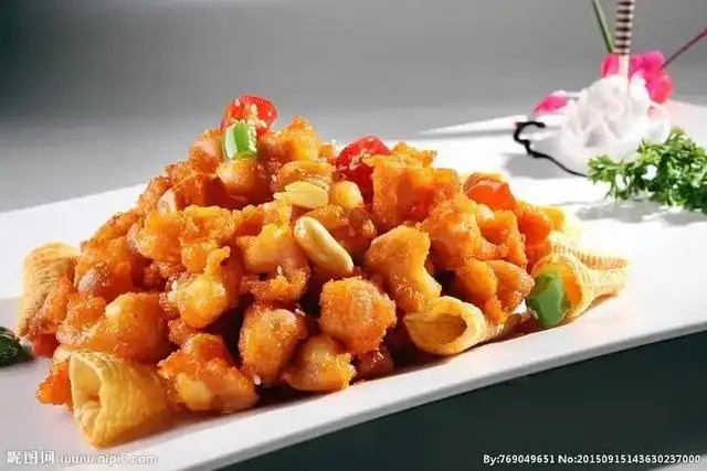 2 ,锅入油烧制五成下入鸡脆骨炸酥。