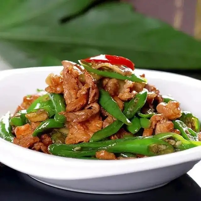 3,锅入油烧制三层热下入瘦肉滑油捞起,待五成热油下入辣椒过油。