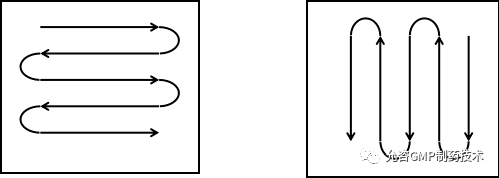 在取样点上选取5cm×5cm(或10cm×10cm)的区域进行水平擦拭取样,用适宜的溶剂湿润药签,并将其靠在溶剂瓶上以除去多余的溶剂。将药签头按在取样表面上,用力使其弯曲,平稳而缓慢地擦拭取样表面。在向前移动的同时将其从一边移动到另一边。擦拭过程应覆盖整个表面。翻转药签,让药签的另一面也进行擦拭。但与前次擦拭移动方向垂直,见如下附图。