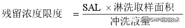 擦拭样提取液中残留浓度限度,该限度通常表示为μg/mL。将SAL乘以取样表面积,再除以所用提取溶剂量(SEA)即得。