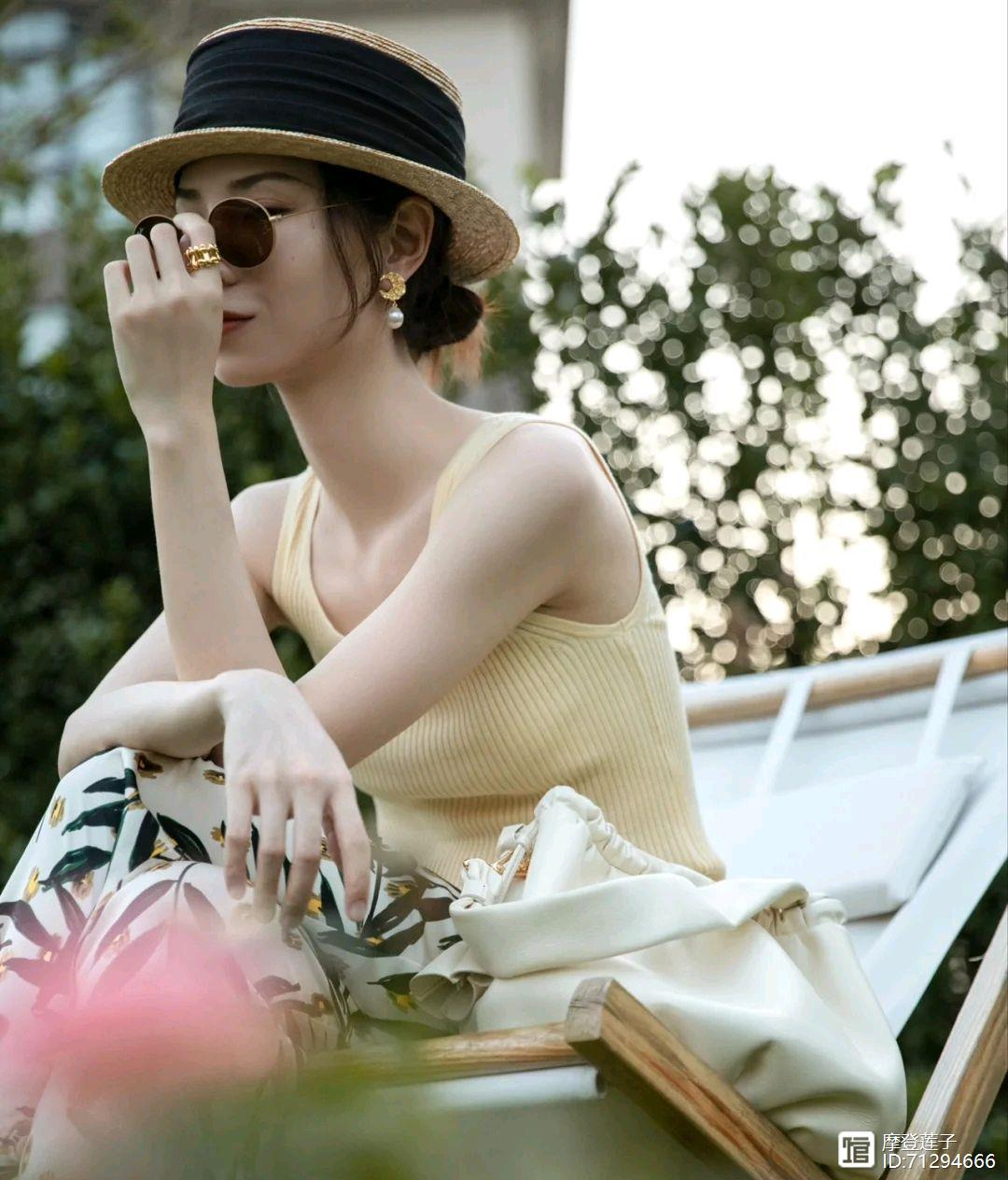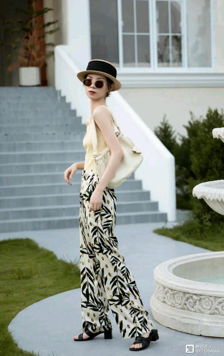 这位时尚博主就很厉害了,她选择了简简单单的淡黄色小背心搭配略显宽松的印花裤子,穿出来的视觉效果会给人一种简约又浪漫的感觉。