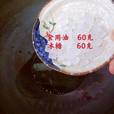3、3⃣️、锅中放60克油、冰糖60克,不断小火翻炒开始冒泡,倒入开水。(切记沿锅的边边一点点的倒)