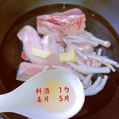 2、2⃣️、锅中放凉水、要卤的肉类:猪肘、五花肉、牛腩、鸡爪,你想吃什么就放什么。放入姜片5片、料酒1勺,大火煮开2分钟去除浮沫,捞出备用