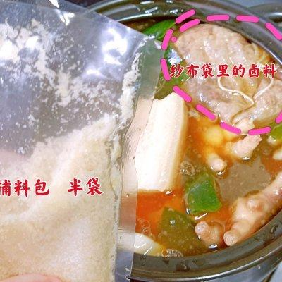 4、4⃣️、砂锅放入要卤的食材:肉肉和海带、莲藕之类的素材,放入纱布裹好的香料包、倒入炒好汤色的热水、加入姜片2片、辅料包(因为我的卤料包是十斤的分量,所以辅料包我只用了一半调味),小火炖煮40分钟左右(海带比较容易熟,20分钟就可以捞出来先)
