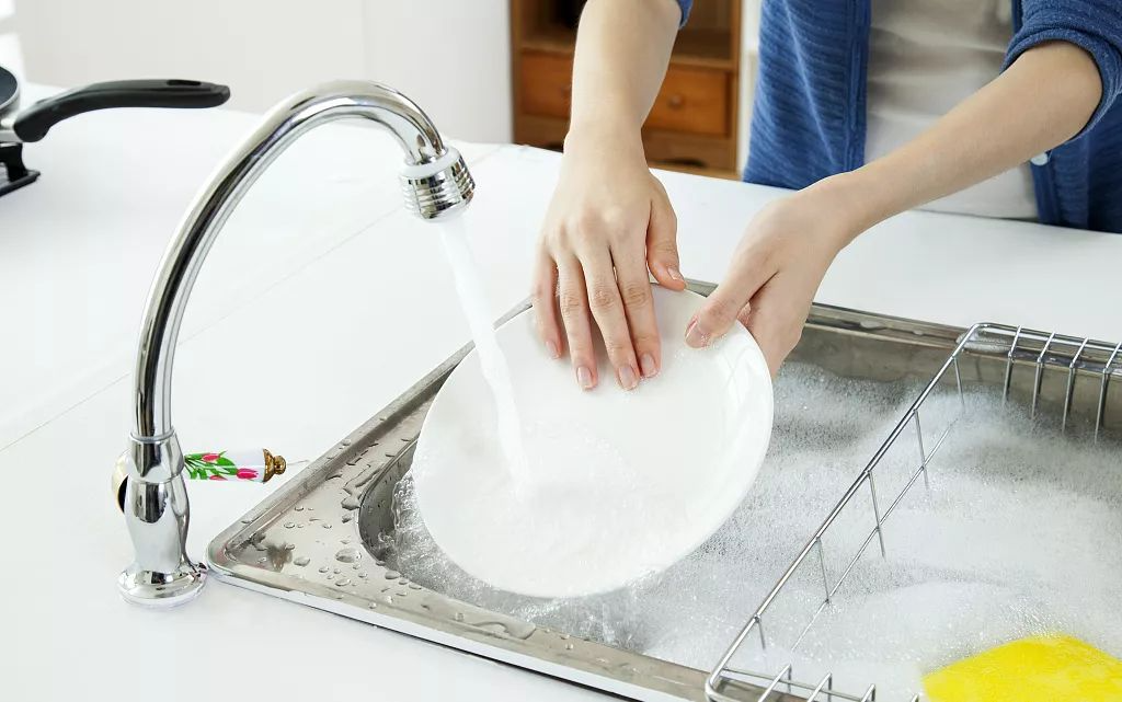 每天洗碗洗菜洗锅都用这个水槽,上面会积累不少的污垢,我们在抹布上倒一些清洁剂再来擦水池,如果污垢结的比较厚的话,可以将醋和温水混合后再擦拭,再用清水冲洗,也特别的干净。