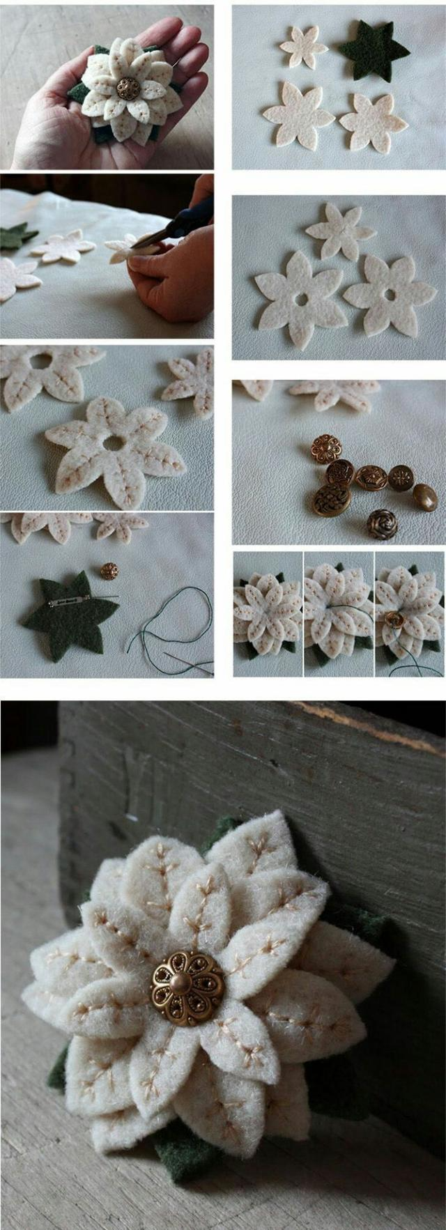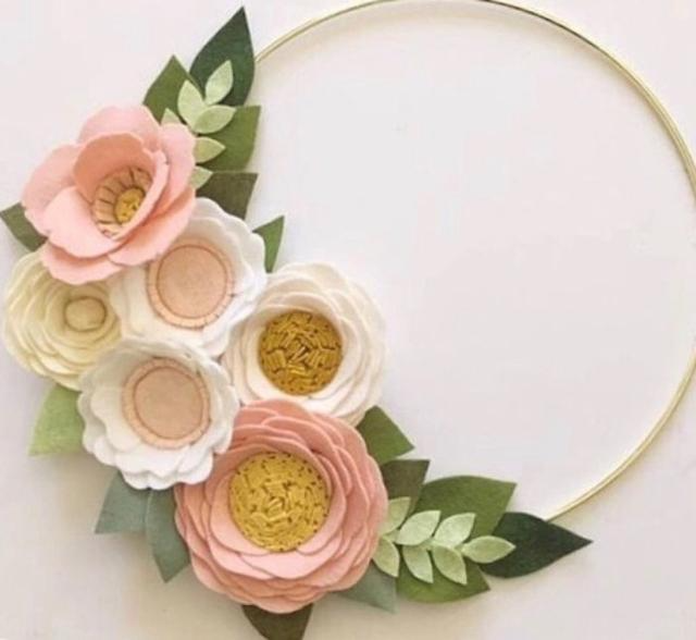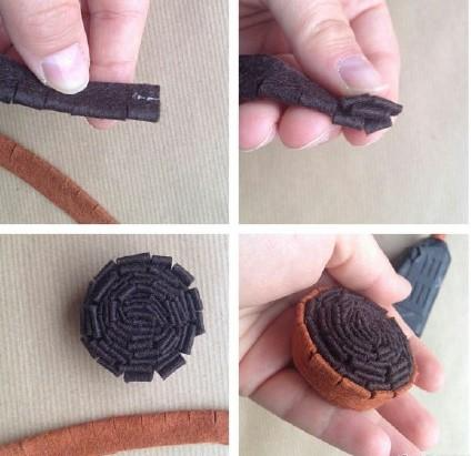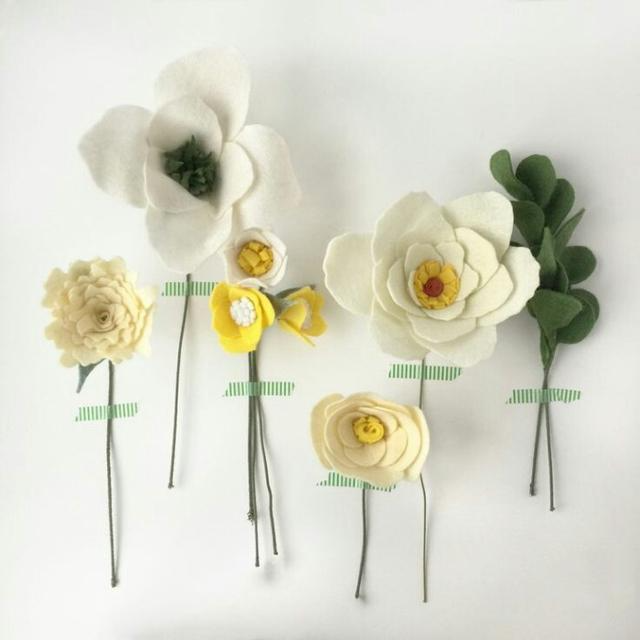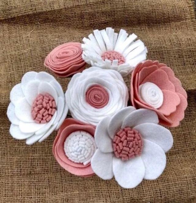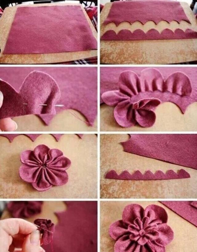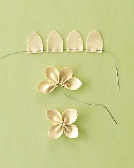只要变换一下单个花瓣的形状,做出来的花朵就不一样了。同样是用针线穿缝,上图做出来的就是四瓣小花花了。