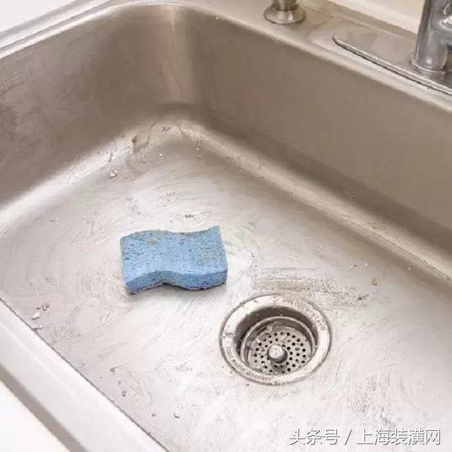 先让水槽湿润,然后撒上小苏打粉,使用厨房抹布擦拭;然后在下水口处再撒些小苏打粉,倒上点白醋,盖上一张面纸,等待约20分钟之后再拿掉,清洁起来会很方便,然后再用橘子皮来擦拭擦拭。擦拭完后,使用干抹布擦干,水槽就变得跟崭新的一样。