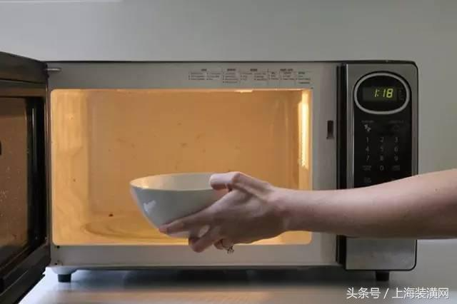 准备一个碗,在碗中倒入柠檬、醋和水(醋、水比例1:4),然后放入微波炉中,高火加热10分钟,然后取出碗,用抹布擦拭微波炉内壁,j加热剩下的柠檬水可以用来清洗微波炉盘。
