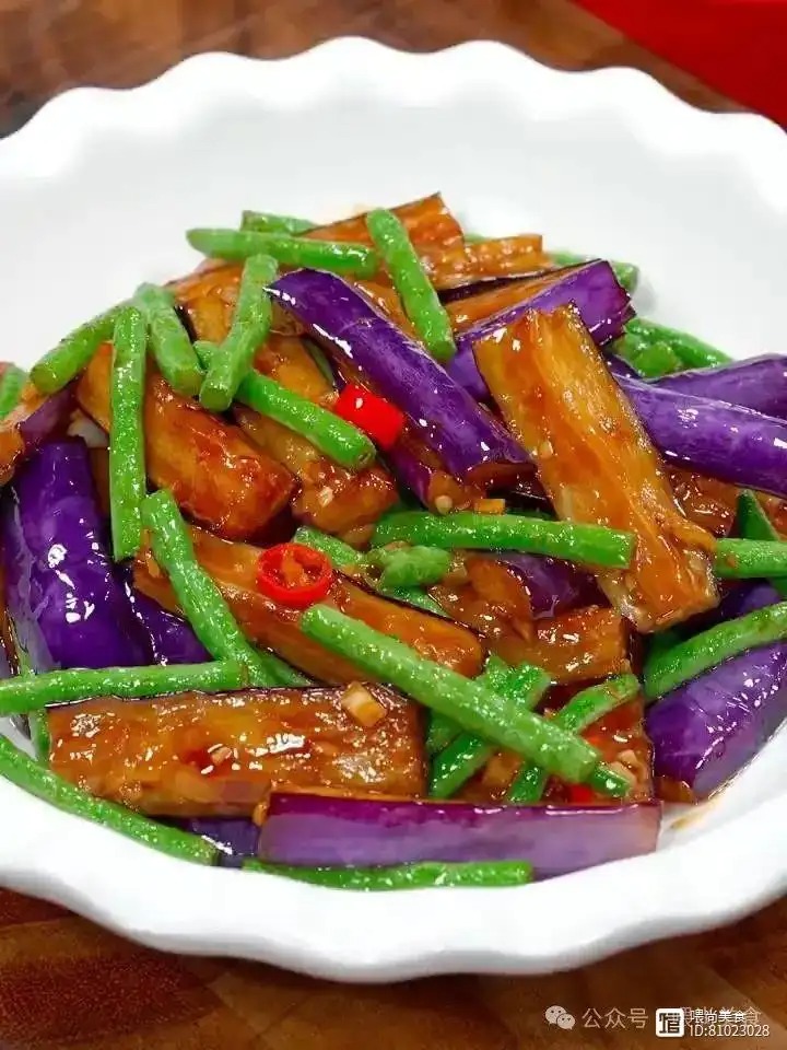 1、把豆角仔细洗净,切成均匀的小段。茄子洗净后切成小条,注意条的粗细尽量保持一致。