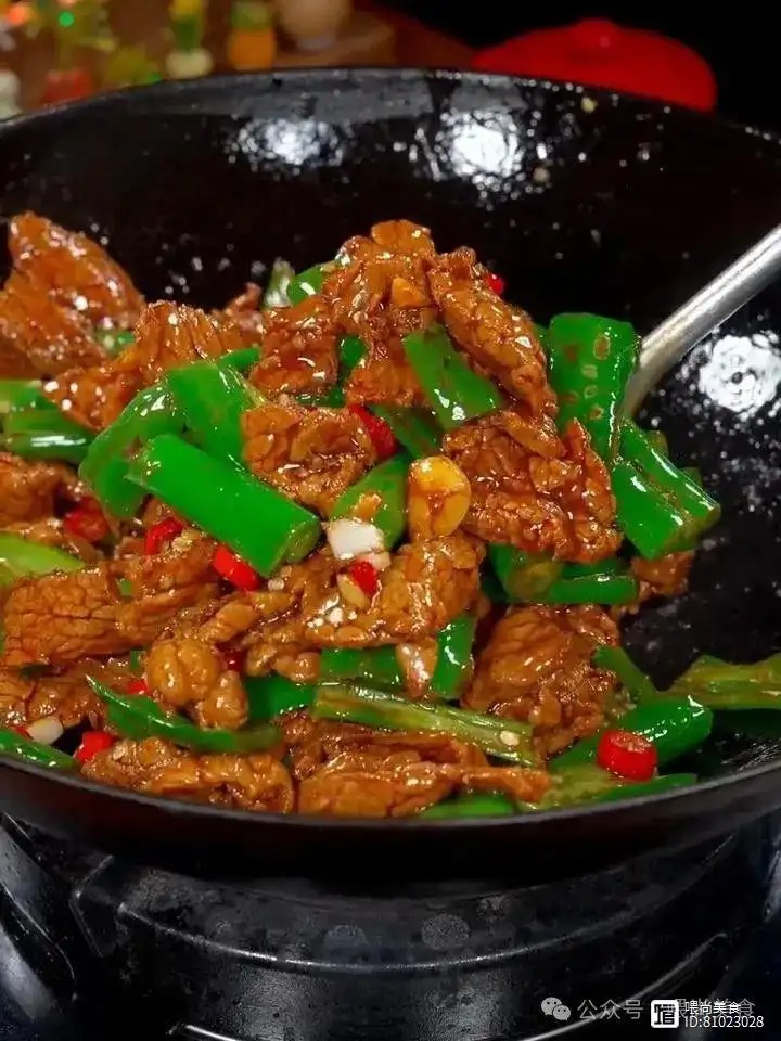 5、最后加入青红辣椒和蒜苗叶,用大火翻炒收汁,使菜肴色泽更加鲜艳,味道更加浓郁,即可出锅享用。
