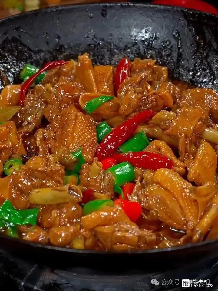 3、当鸭肉中的水分基本炒干后,放入葱姜八角、香叶、干辣椒,接着加入适量生抽、老抽、蚝油、盐、鸡精,开大火快速翻炒,炒出香味并使鸭肉均匀上色。