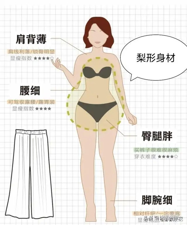 如果将我们的身材类型看作水果的话,梨形身材的外形就像一颗小梨子,肩背薄,腰部尤为纤细,但臀腿位置赘肉格外明显。尤其是在购买裤子时,梨形身材可是添了不少烦恼呢~
