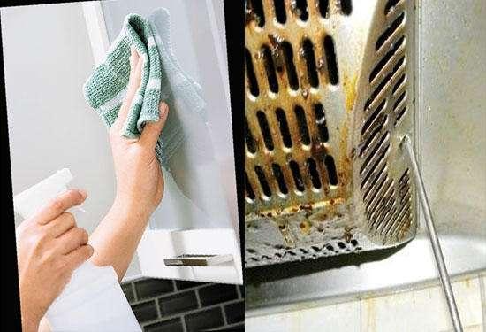 在做菜的时候,常常会有些汁液溅在炉灶上,在做完菜后,借助炉灶的余热用湿布来擦拭,其效果非常好。若要清除灶上陈旧的污垢,可喷些清洁剂在灶台上,然后再垫上些旧报纸,再喷些清洁剂,几分钟后,将报纸撤去,用沽着清洁剂的报纸将油点擦去即可。