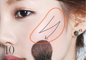 STEP10:在图中橙色范围内用腮红刷蘸取粉色的腮红来回向下刷。