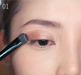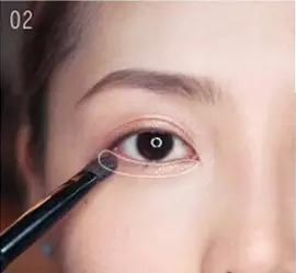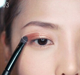 STEP2:蘸取棕色的眼影刷在眼窝一半的位置,眼睛睁开后也要能清楚的看到棕色的眼影。