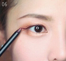 STEP6:深棕色的眼影更加柔和适合这款淑女妆。沿着睫毛从眼头向眼尾画眼线。