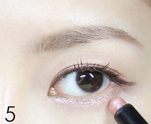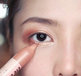 STEP5:浅粉橘色的卧蚕笔在下眼睑的眼头至眼中的位置提亮。