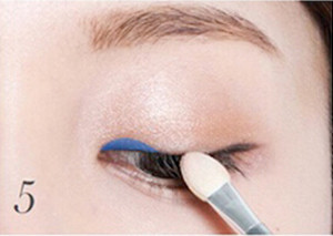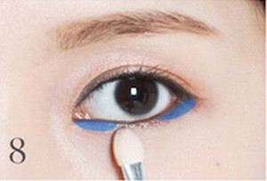 STEP8:用干净的眼影棒将图中蓝色范围的眼线微微晕染。注意一定不要讲晕染的弧度弄得很大,否则看上去会像是黑黑的熊猫眼。