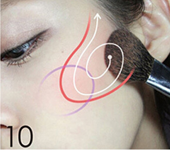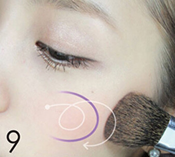 STEP9:用橘粉色的腮红重点涂抹在图中紫色范围内也就是笑肌的中心处,涂抹方向按照图中白色箭头所示。
