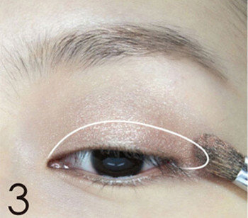 STEP2:蘸取含有珠光的米色眼影晕染在图中的白色范围内,为眼窝提亮。