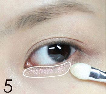 STEP5:用干净的眼影刷蘸取少量的珠光浅粉色眼影晕染在下眼睑的前半段到中段,如图所示的范围,让眼睛看上去更加水灵灵。