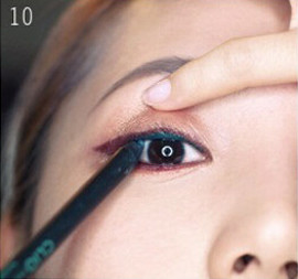 STEP11:下眼睑的也用孔雀蓝的眼线笔晕染内眼线。蓝色眼线一定要在酒红色眼线之内。两种颜色的对比更有强烈的视觉效果。