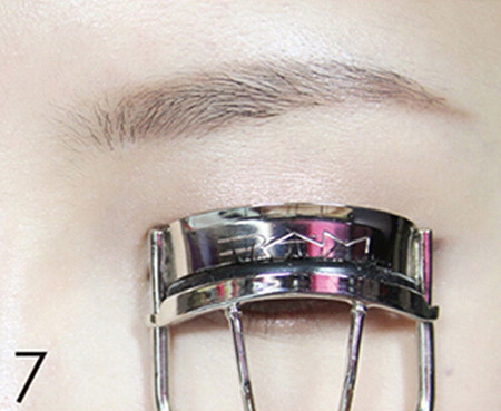 STEP7:耷拉下来的睫毛看上去没有精神,用睫毛夹再夹一下,但是只能夹睫毛根部的地方,而且用力不要过猛,否则睫毛膏会断层,反而把妆弄花。