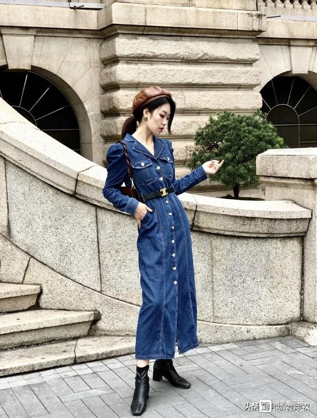 牛仔长裙搭配黑色短靴整体上简约大气,特别有时髦感!特别是点睛之笔腰带,腰带提高了腰线把身材比例划分得非常好,整体看上去整个人显得高挑。