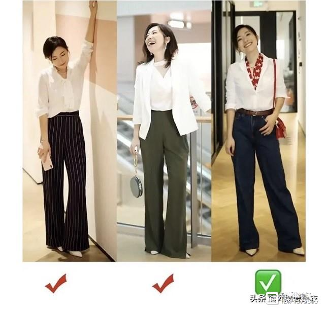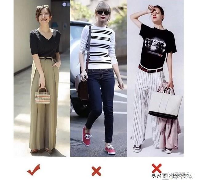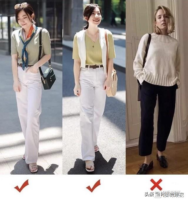 第一种搭配短款上衣配高腰裤,把整体比例拉到三七分这样看起来就不会五五分,而且整体身材还显高。
