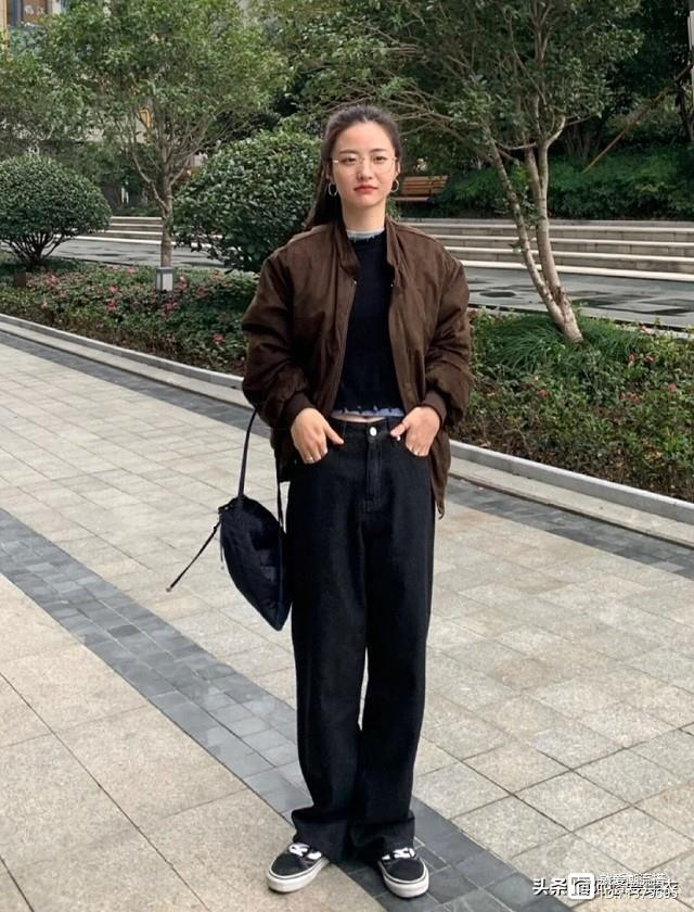 上紧下松的穿搭法则不仅会把身材比例调整的更好,而且这个穿搭方式非常显瘦。短款黑色打底衫搭配宽松阔腿裤,适当露出小蛮腰视觉上更加显瘦。特别是高腰阔腿裤拉长腿部线条显得更加高挑一些。在秋冬季节感觉寒冷,还可以加一件外套只是外套不要过长会压身高。