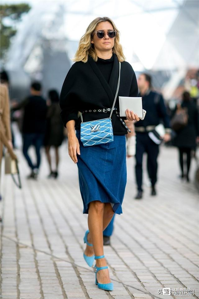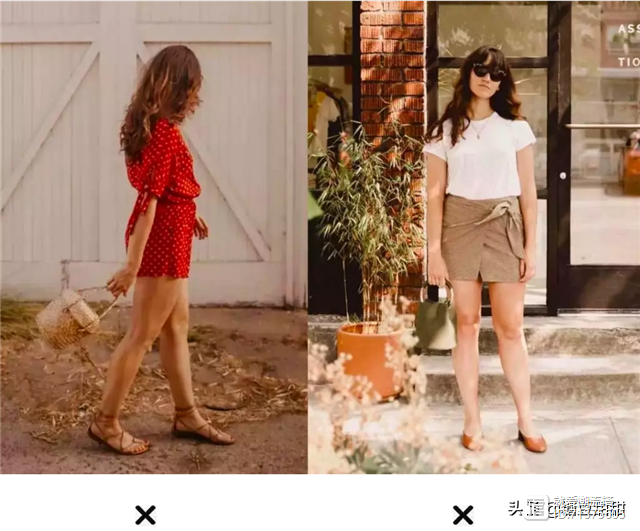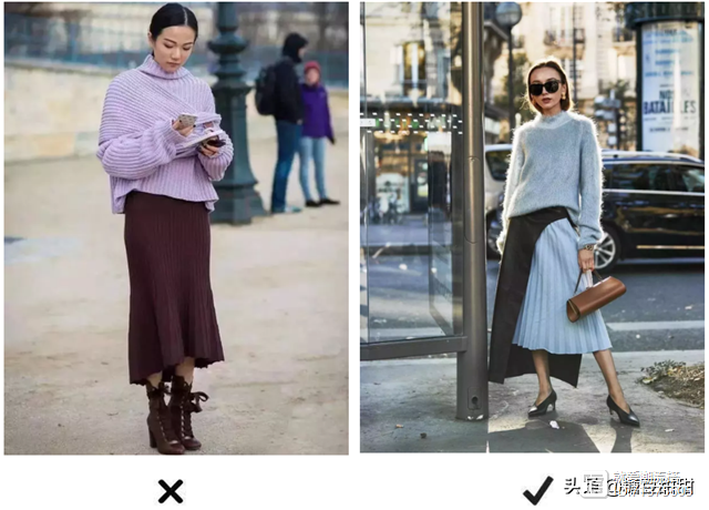 举个例子,下面的裙子长度就是不一样的,一个长度在膝盖附近,并且搭配了短靴,很容易把我们的脚踝遮住,显得非常沉闷和厚重,反倒是拉低气质,而聪明的你可以选择露出脚踝的裙子,搭配高跟鞋,精致还干练。