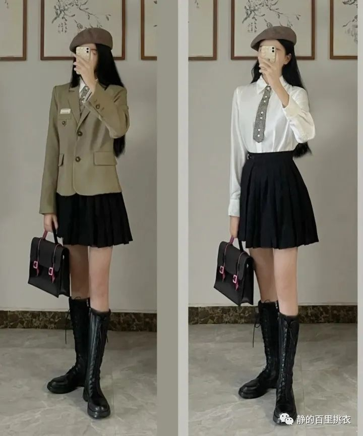 这套衣服也是主打校园风格,纯白色T恤加一个咖色领带,外面配上一个精巧的西装外套。下半身是一个束腰型黑色短裙,长筒马丁靴,让整个人看起来更为优雅从容,同时不失甜美。