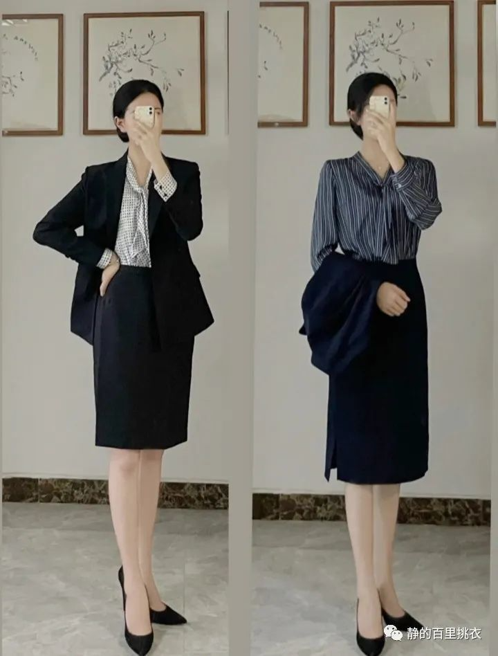 穿搭整体大方干练,很适合在日常工作中穿搭。黑色西装再加上一个包臀过膝裙子,里面无论搭配哪种款式的衬衫,都显得十分有气质。