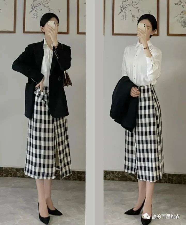 上身是一个白色衬衫,下面是一个黑白格长裙,外面配上一个黑色西服,简简单单的两种颜色搭配。通过衣服设计的不同,却让整体看起来并不违和。