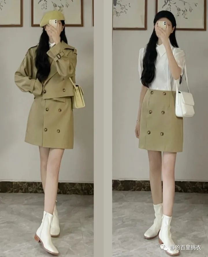 衣服整体的穿搭法式休闲风格,看起来很简约大方,给人一种甜美有气质的感受。白色衬衫,外面搭配一个短款的咖色风衣,下半身是一个高腰的咖色a字裙,上下层次分明,同时可以显出身材。